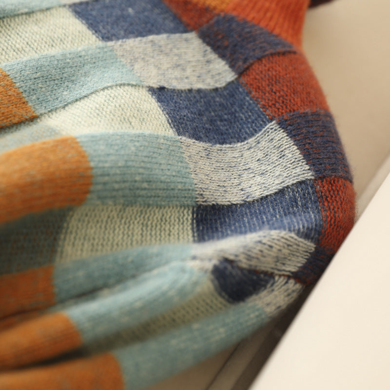 This sweater is both soft and warm, making it perfect for chilly fall days. The check pattern adds a touch of sophistication to the classic turtleneck design, while the turtleneck itself adds extra warmth and coziness.